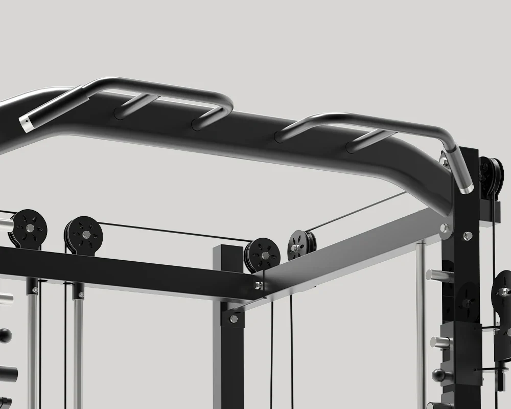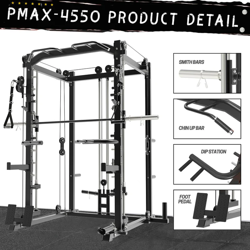 The PMAX-4550 Functional Trainer Smith Machine provides a diverse array of resistance training possibilities, catering to various fitness objectives. It combines features such as a Smith Machine, Pull-up Bar, Cable Crossovers, and Dip Station, making it a versatile tool for toning and strengthening the core, chest, thighs, arms, back, and legs. Additionally, it stands out in its price range, retailing for just under $1000, making it a rare find in the market.
