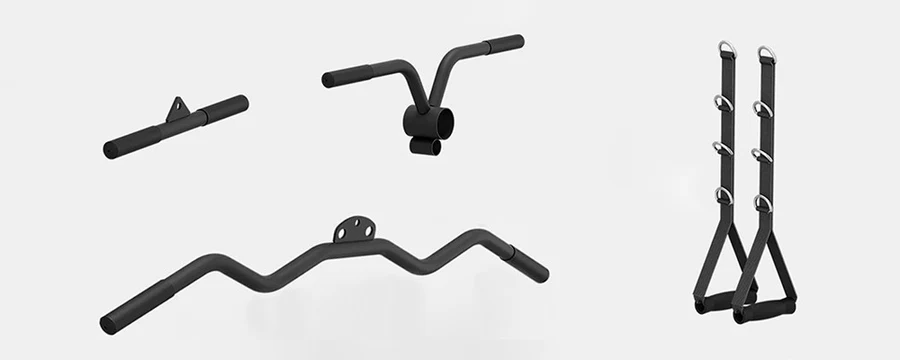 PMAX-4550 includes all the attachments shown in the image, allowing you to craft your ideal home gym. Dive into a world of diverse exercises, including Wide & Narrow LAT Pull-down, Dips and Cross-over Training.