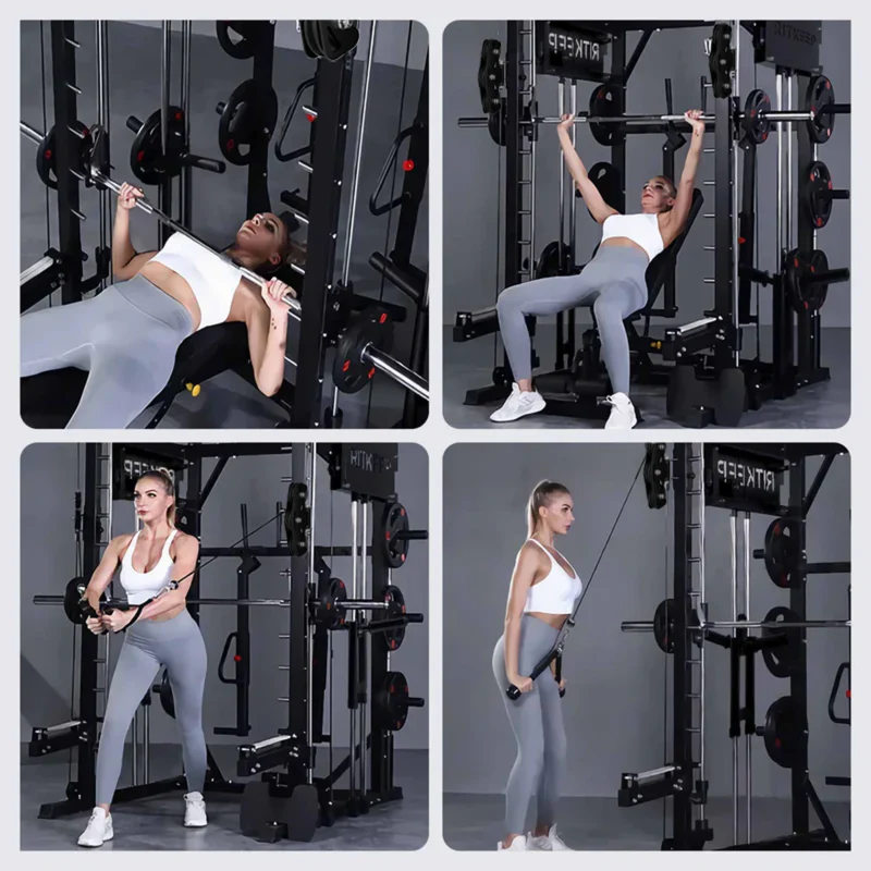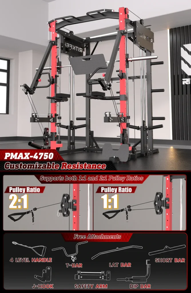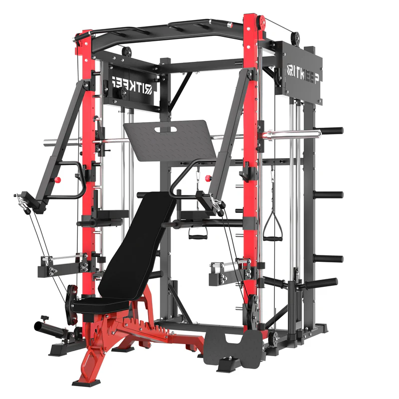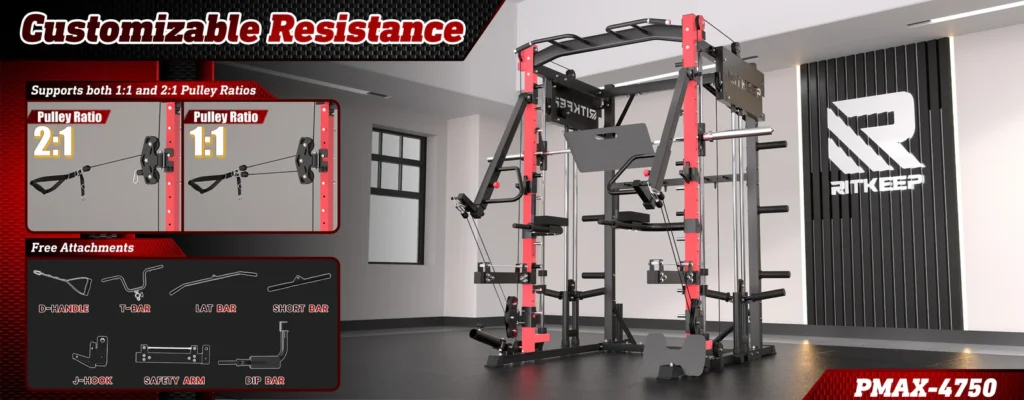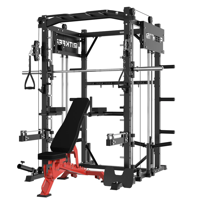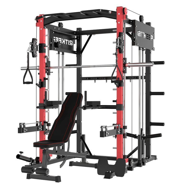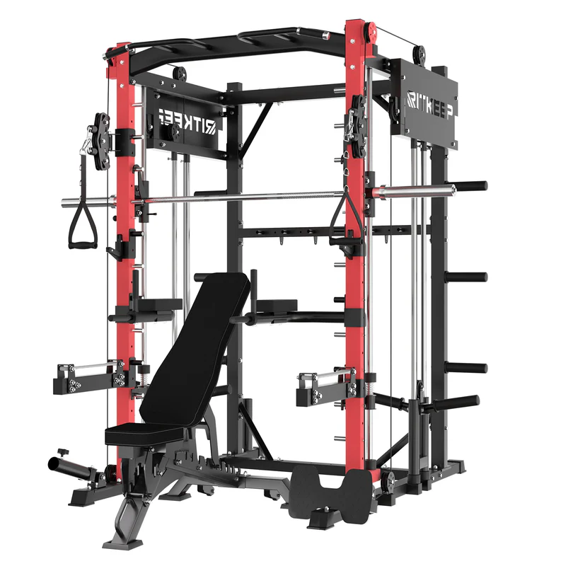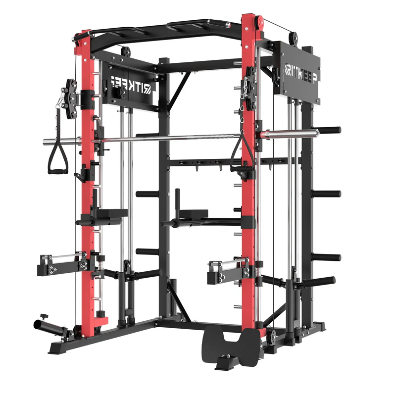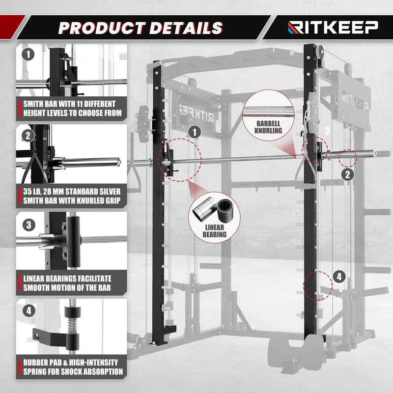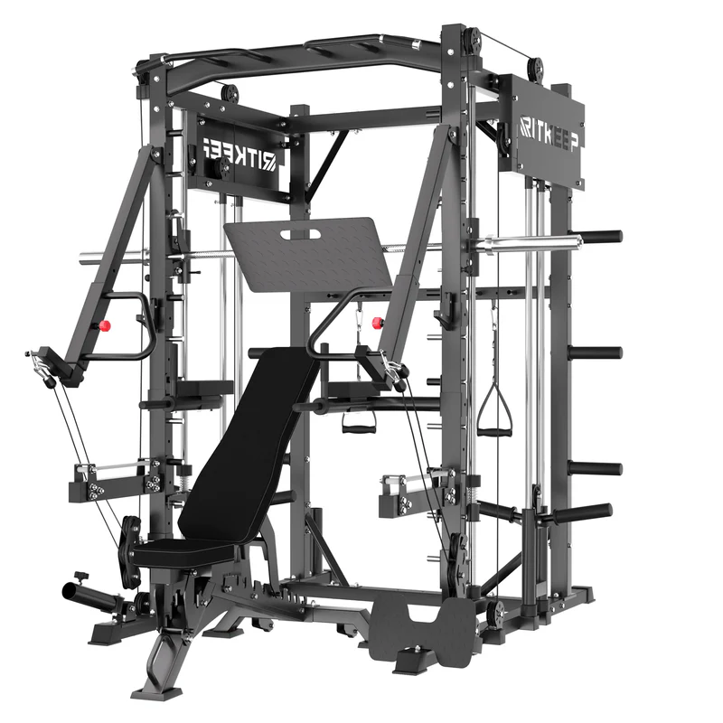 The RitKeep PMAX-4750 Smith Machine is an all-in-one weight-training apparatus featuring a fixed path barbell, safety catches, and spring-loaded stops for unmatched security during workouts. It offers over 100 exercise options, catering to various fitness goals.