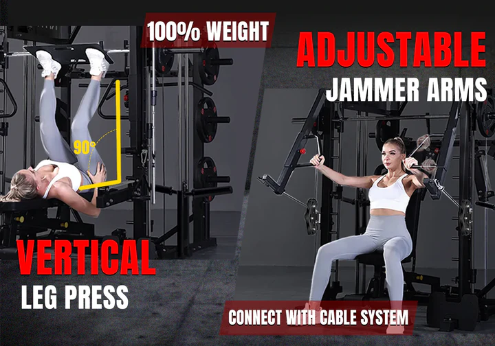 The most standout features of this machine are the extra Jammer Arms and leg press plate. Integrated with a pulley system, the Jammer Arm offers effortless, weight-free adjustments and smooth transitions between exercises. Additionally, the leg press plate allows you to train with the Smith Bar in a comfortable, horizontal position. Imagine performing leg presses while the tread pattern ensures maximum stability and grip, letting you focus on your workout without any distractions.